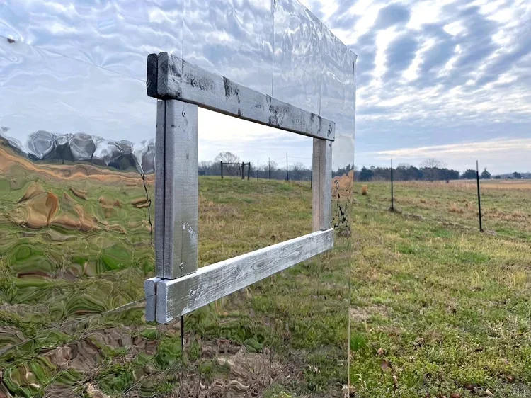 Cody Norton. The Land Looking Back, 2026, mirror tiles, wood, acrylic paint, native foliage.