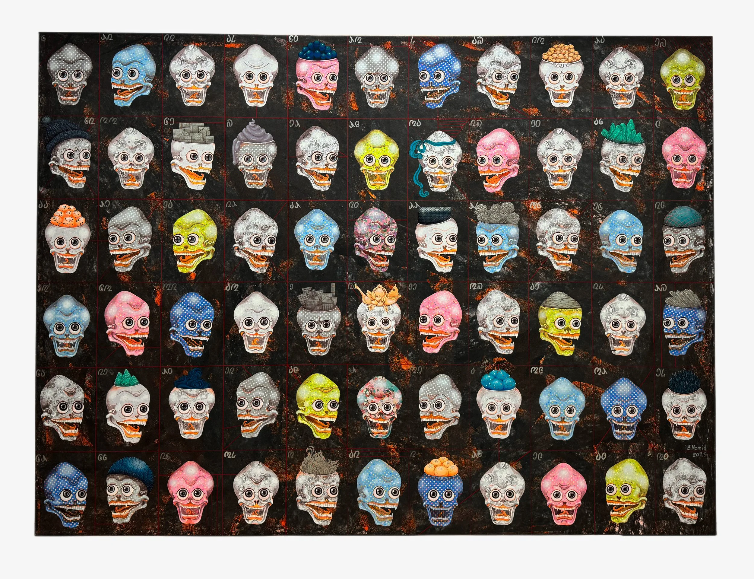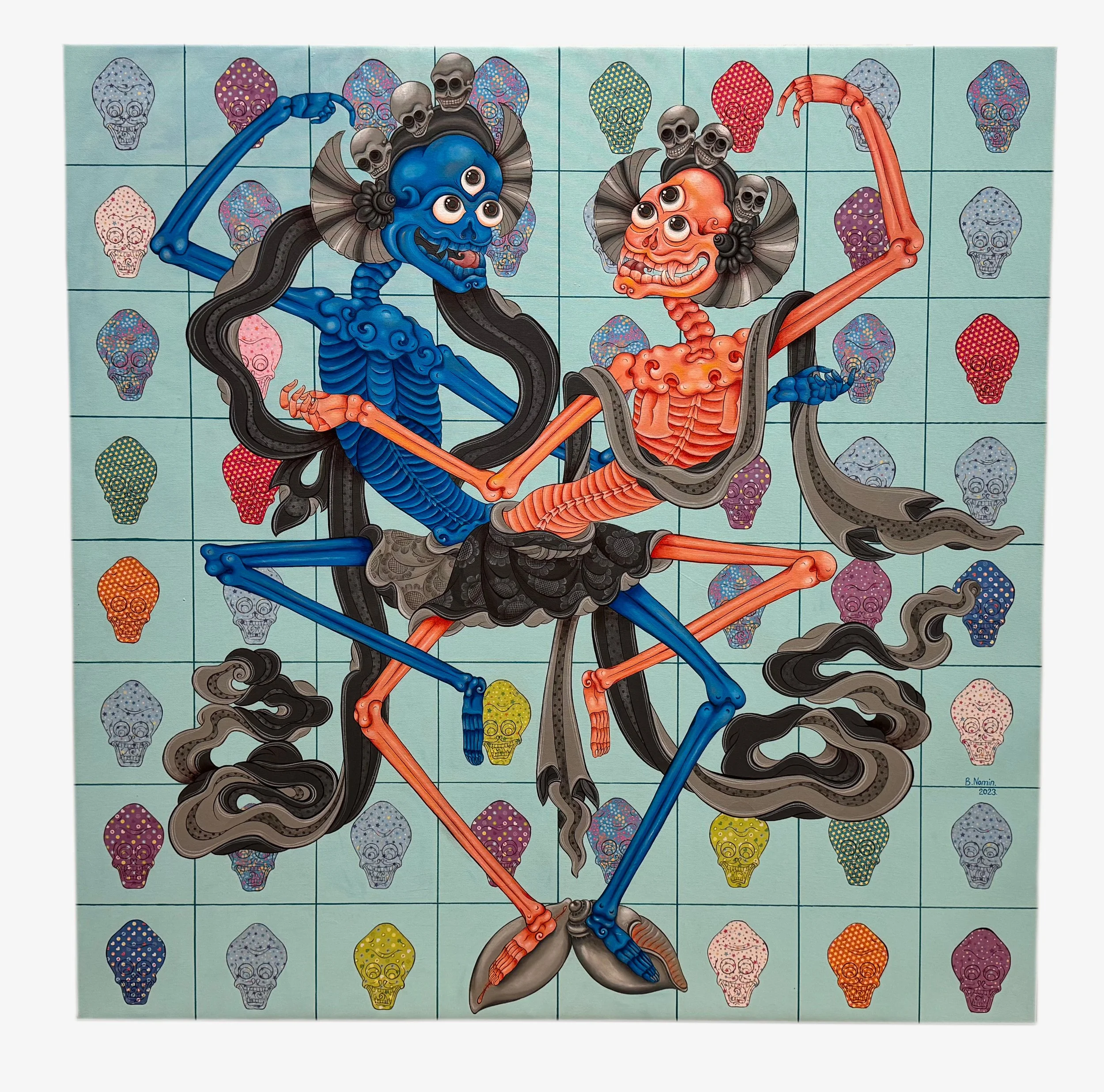 Nomin Bold is a multidisciplinary artist, trained and specialized in Mongolian traditional painting Mongol Zurag. Bold’s work focuses on a critical approach to Mongolian’ society transition into modernity in a global era. The artist departs from personal experience, expressing internal struggles in a generation experiencing friction between tradition and modernity. Bold’s oeuvre brings an unexpected combination of heterogeneous visual elements full of detailed references and symbols. Buddhist imagery in Nomin’s art serves as motifs and emblems of past traditions placed amid contemporary commodification. Her compositions are inspired by questions about the nature of tradition and how it can be subverted, transfixed, and transformed by modernity.