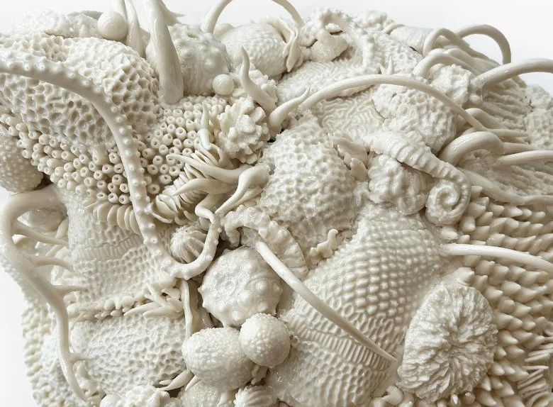 The Liliana Bloch Gallery is proud to present a series of Selected Works by Saba Besier. Saba's work acknowledges the ecological trauma and impact of human effect on our world and the species that inhabit it. Her recent work draws attention to the ocean, as coral reefs and marine life are at risk and struggling from the effects of climate change and pollution. Saba deliberately leaves sections of her work uncolored to allow the natural pale ivory color of the porcelain to shine through, mimicking the bleaching of real-life sea organisms. Saba utilizes her expertise with slab building, throwing, hand sculpting, metallurgy, and alchemy to create her sculptures and ceramic pieces.